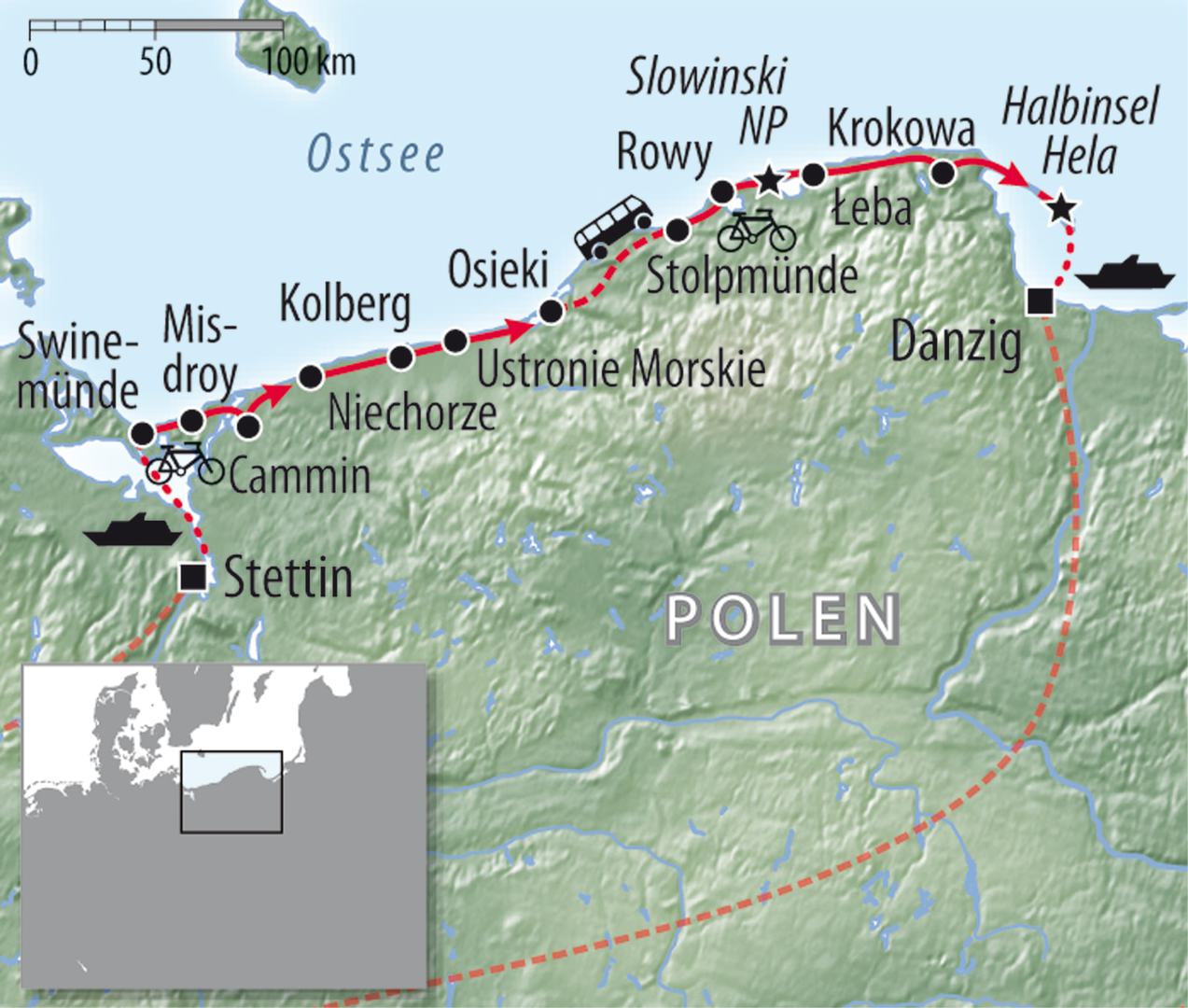 Etwa 500 km erstrecken sich die breiten, strahlendweißen Strände der Ostseeküste in Polen von der Insel Wolin bis zum Frischen Haff. Diese Radreise führt Sie von den Werften und der Oder in Stettin bis zu der Hansemetropole Danzig, der so genannten Perle der Ostsee. Nachhaltige Landschaftseindrücke mit den Wanderdünen von Łeba, die Küstenwälder und die atemberaubende einsame Landschaft von Pommern. Sie radeln immer Richtung Gdańsk/Danzig und lernen die Hansemetropole mit der prächtigen Langgasse und das prachtvolle Backsteinwerk der Marienkirche kennen.
