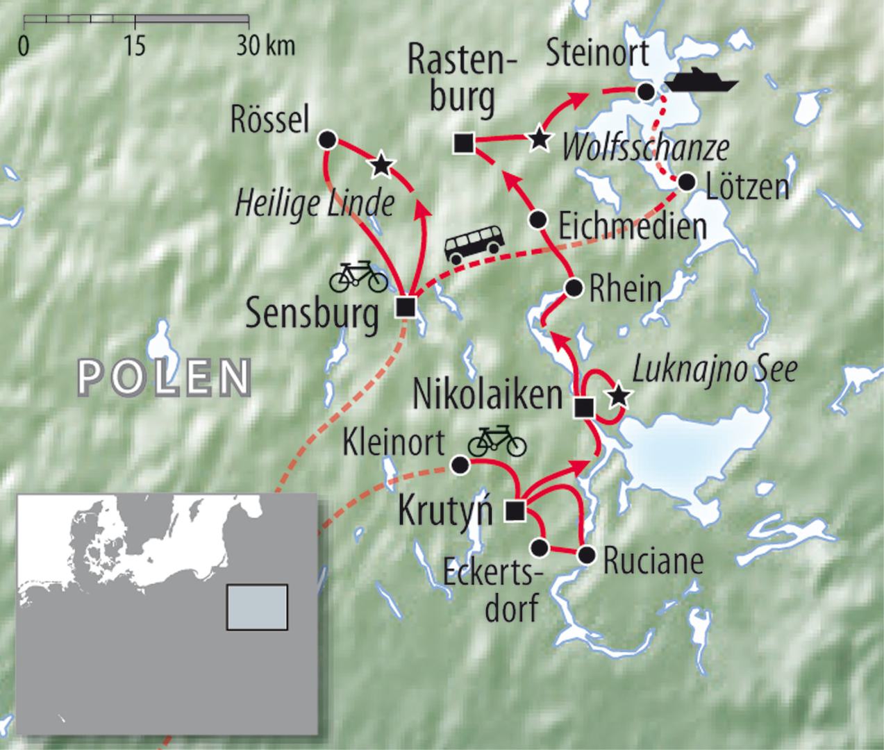 Auf dieser Radreise Masuren erleben Sie Natur wie aus einem alten Bilderbuch: schwarze Wälder, sanfte Hügel und verträumte Dörfer. Tausende größere und kleinere Seen glitzern wie Juwelen inmitten ausgedehnter Wälder. Die Masurische Seenplatte ist eine der schönsten Landschaften Polens. Ein Naturparadies für weiße Störche. Hier schwimmen in den Seen Aale, Hechte, Barsche und durch die Wälder streichen noch Wölfe, Luchse, Marderhunde, Wisente und Polnische Pferde, die so genannten Tarpane. Die friedvolle Ruhe in riesigen Urwäldern und Naturparks, weite Heideflächen, kristallklare Flüsse und Seen sowie über hundertjährige Alleen prägen die Landschaft. Es wurden bisher fünf Landschaftsparks und zahlreiche Naturreservate in dieser Region gegründet. Die Masuren zählen zu recht als Grüne Lunge Polens zu einer der schönsten Radwander-Regionen Europas. Sie können die herzliche Gastfreundschaft, der hier wohnenden Menschen, kennenlernen und für sich den Zauber auf der Fahrradtour Masurische Seen mit seinen geheimnisvollen Ecken entdecken.