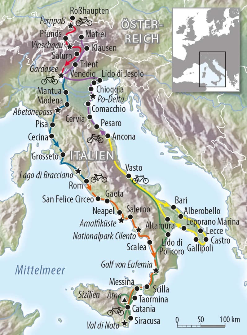 „Italien auf dem Rad – diese Tour hat alles! Stille Wege, hektisches Gewirr in den Städten, sanfte Flußläufe, Meer und Berge! Und dazu eine radbegeisterte Nation“