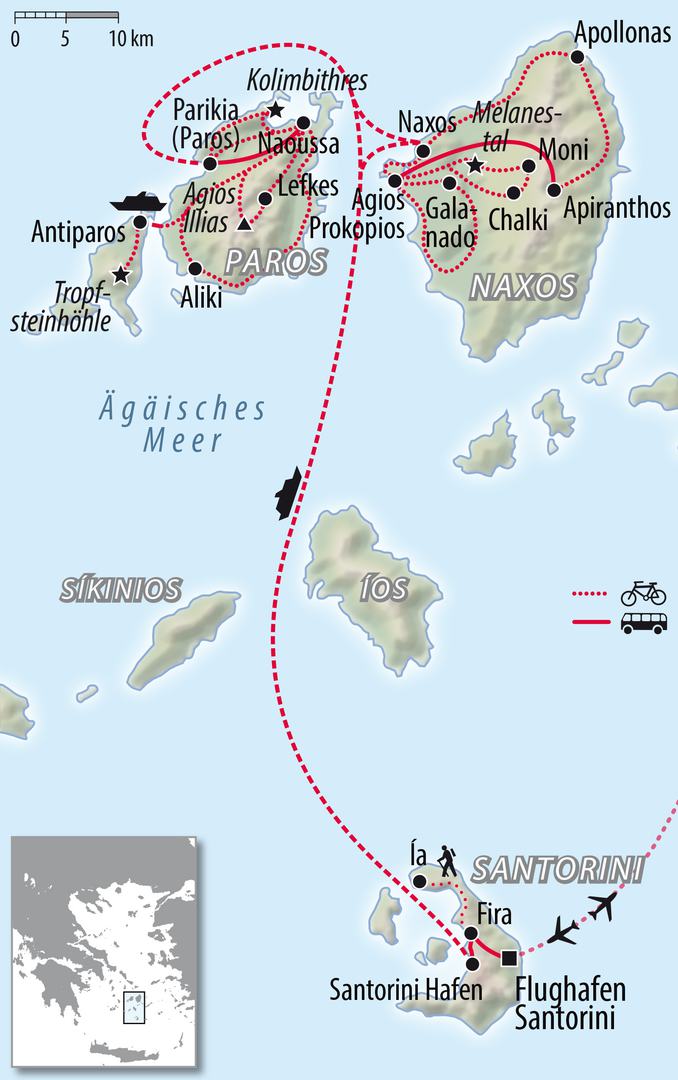 - Paros, Naxos, Santorini und Antiparos – die schönsten Inseln der Kykladen -entspannt per E-Bike erkunden.