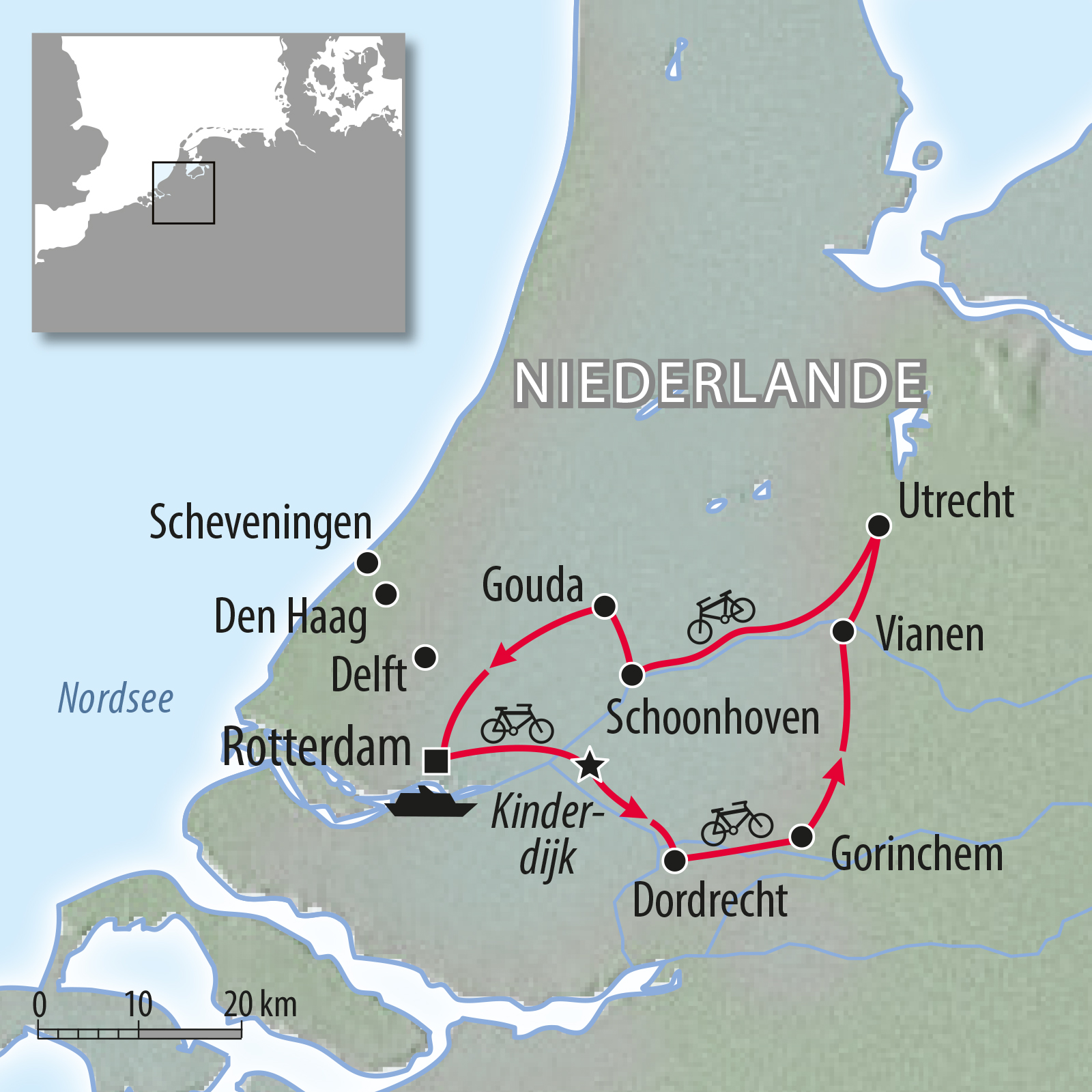 *Abhängig von der behördlichen Vergabe der Liegeplätze kann auch Vianen als Alternative für Schoonhoven angelaufen werden. Fahrplandann am 5. Tag Utrecht–Vianen, Radtourca.48-59kmund am 6. Tag: Vianen–Gouda–Rotterdam, Radtour, ca.59km. Endgültige Vergabe der Liegeplätze im Frühjahr 2025