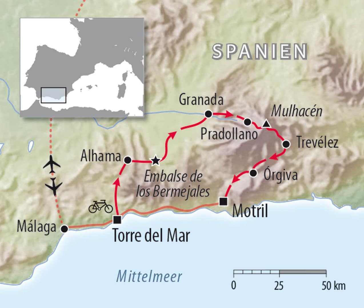 Verträumte weiße Bergdörfer, spanischer Serrano-Schinken sowie 14 Gipfel jenseits der 3000 Metermarke machen die Sierra Nevada zu einem unvergesslichen Erlebnis im sonnenverwöhnten Andalusien. Die Tour führt von Malaga in die grüne Südflanke der Sierra Nevada mit den weltbekannten weißen Bergdörfern. Dabei nächtigen wir auch im geschichtsträchtigen und verzauberten Granada, bevor wir den höchsten Pass Europas überqueren. Ein rundum Sorglospaket mit Halbpension in kleinen Hotels und einem Begleitfahrzeug samt Gepäcktransport sorgen für Komfort und unser Wohlbefinden.