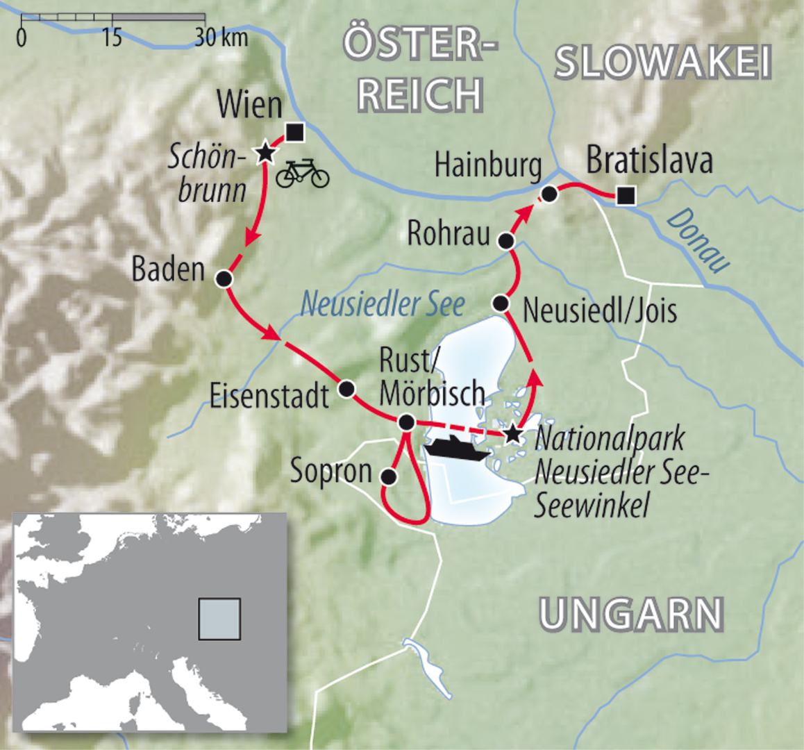Südöstlich der Walzermetropole Wien, wo sich Puszta, Schilfgürtel und Weinberge treffen, liegt das einzigartige Naturschutzgebiet Neusiedlersee. Sanfte Weinhügel, Schilfgürtel und Salzlacken prägen diese Landschaft. Dazwischen liegen idyllische Dörfer mit Storchen-Nestern auf den Dächern, seltene Vogelarten und seltene Tierarten. Zwischen diesen Highlights verweilen Sie in bekannten Städten mit vielen kulturellen Höhepunkten. Haydn war einer der bekanntesten Künstler und die Esterhazys die Grafen und Könige. Urlaub im Nationalpark Neusiedlersee – jüngstes UNESCO-Weltkulturerbe Österreichs – bedeutet: Puszta-Romantik mit unvergesslichen Sonnenauf- und Sonnenuntergängen, pannonisches Klima und rund 300 Sonnentage im Jahr. Das Wassersport-Eldorado für Segler und Surfer bietet zu Land hervorragend ausgebaute Radwege in einer zauberhaften Landschaft mit vielfältiger Fauna und Flora. Wir haben für Sie die schönsten Strecken zu einer wunderschönen Reise vereint. Freuen Sie sich auf unsere Neusiedlersee Rundfahrt!