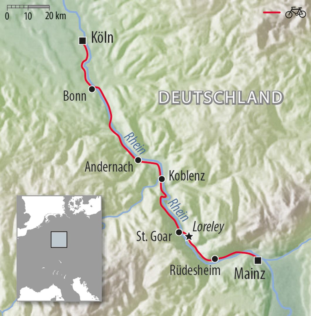 Das UNESCO-Weltkulturerbe Oberes Mittelrheintal ist ein Paradies für Romantiker. Folgen Sie dem Rhein durch eine reizvolle Hügellandschaft, in der adelige Bauherren viele Schlösser und Burgen bauen ließen und in der liebevoll gestaltete Fachwerkhäuser die Altstadtgassen prägen. Zugleich erleben Sie eine Landschaft, die sich wildromantisch zeigt und Heimat vieler Sagen wie die der Loreley geblieben ist. Ihre Reise von Mainz bis zur Domstadt Köln ist nicht zuletzt eine mit vielen kulinarischen Genüssen. Am Rhein gedeihen Trauben für großartige Weine und die Kochkunst steht dem Können der Weinbauern um nichts nach.