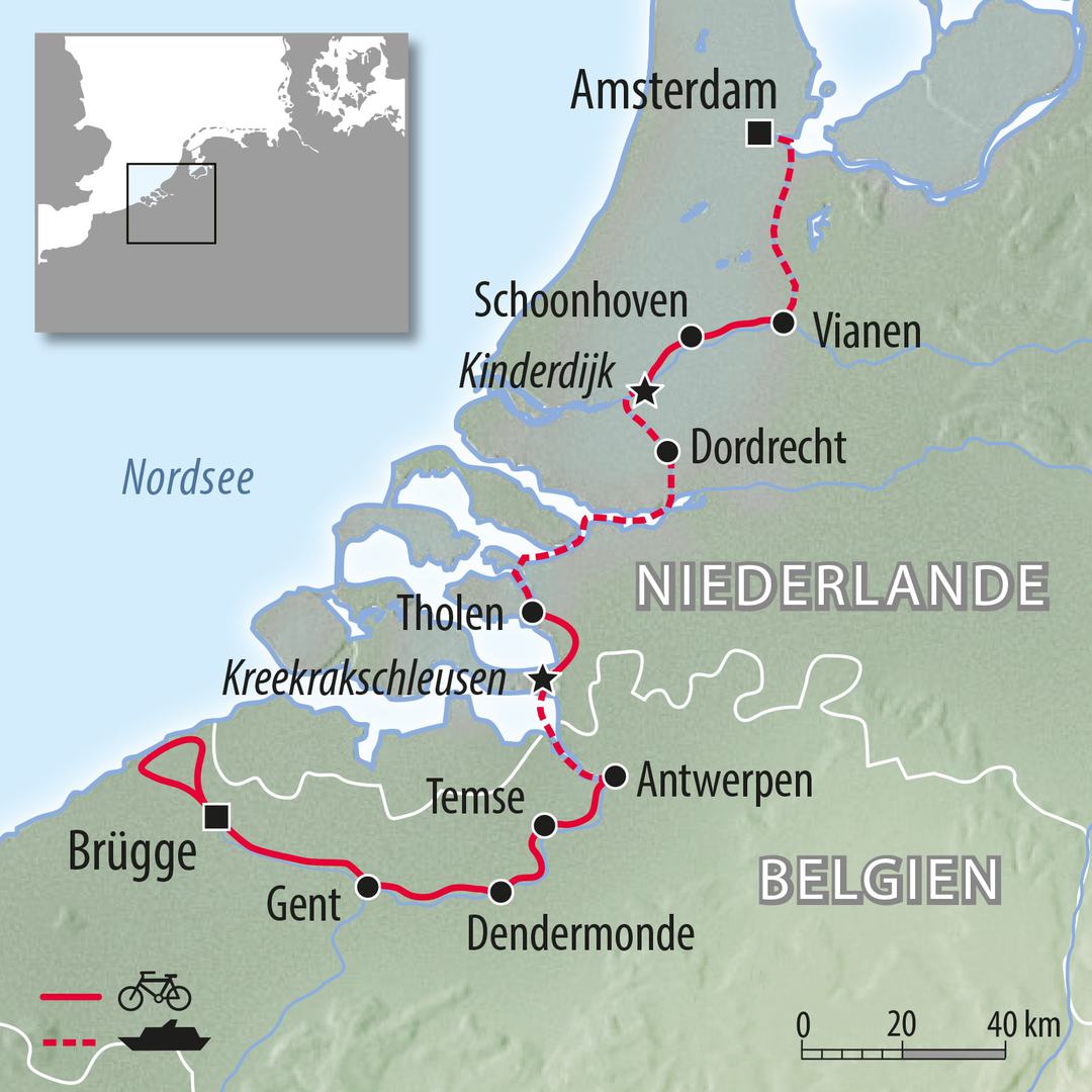 Heute fahren Sie mit dem Rad eine schöne Strecke entlang der Lek nach Schoonhoven — eine Stadt, die schon seit dem 17. Jahrhundert die besten Silberschmiede hervorbrachte und deshalb auch als Silberstadt bekannt ist. Nachmittags fahren Sie durch den Polder Alblasserwaard nach Kinderdijk. Dieser Ort ist für seine 19 in einer Reihe stehenden Windmühlen berühmt. Diese beeindruckenden Windmühlen gehören zum UNESCO-Weltkulturerbe und sind eine der wichtigsten Sehenswürdigkeiten der Niederlande. Hier können Sie eine der Windmühlen von innen besichtigen, also nicht die Kamera vergessen! Im nahegelegenen Alblasserdam nehmen Sie den “Waterbus,” eine Expressfähre, die Sie mit dem Rad innerhalb von ca. 10 Minuten nach Dordrecht bringt. Dordrecht, von den Einheimischen auch “Dordt” genannt, ist eine der ältesten Städte der Niederlande und liegt an einer Stelle, an der drei große Flüsse zusammenfließen. Nach dem Abendessen können Sie mit dem Reiseleiter einen kurzen Stadtrundgang unternehmen, einige der über 1.600 Baudenkmäler in Dordrecht besichtigen und die Stelle besuchen, an der die verschiedenen Wasserwege zusammenfließen.