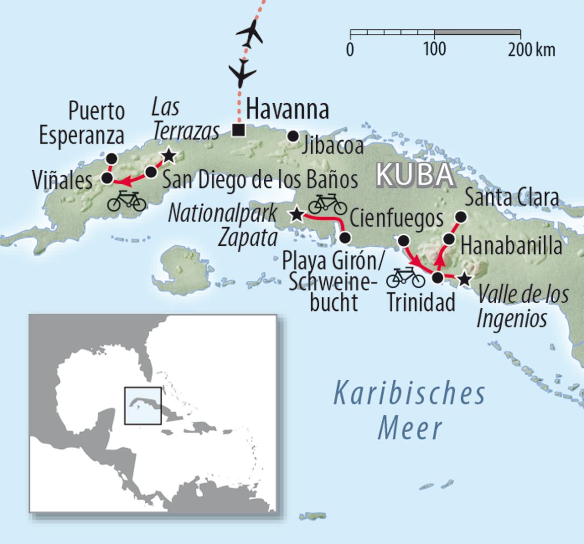 Die Tour teilt sich – neben einem dreitägigen Aufenthalt in Havanna – im Wesentlichen in drei Programmschwerpunkte auf: Der erste Teil führt Sie durch Zentralcuba. Die herrliche Mittelgebirgslandschaft der Sierra Escambray (höchste Erhebung 1140 m) und die südliche Karibikküste prägen die Tagesetappen. Der kubanischen Kultur, dem karibischen Lebensgefühl und der revolutionären Vergangenheit begegnen wir in Santa Clara, Trinidad und in der Schweinebucht. Mit dem Begleitbus geht es dann in den Westen Cubas, zum zweiten regionalen Schwerpunkt der Reise. Hier erwartet Sie erneut ein Mittelgebirge, die Sierra del Rosario, die als einzigartige Naturerscheinung unter dem Schutz der UNESCO steht, die Cordillera de Guaniguanico (maximale Höhe 699 m), und dem faszinierenden Valle de Viñales mit den bekannten Kalksteinhügeln den „Mogotes“, verschiedenen Höhlenkomplexen und den weltberühmten Tabakplantagen. Ab Strand von Jibacoa legen wir zum Abschluss einen Badestopp ein bevor wir zurück nach Europa fliegen.