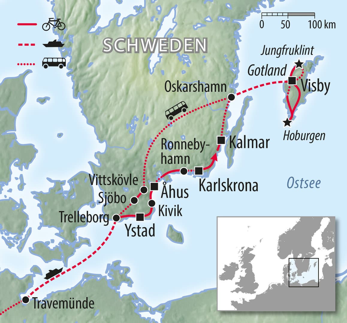 Ein Sommertraum: Von der schwedischen Südspitze bei Trelleborg und Ystad radeln wir an der Küste entlang bis nach Kalmar mit seinem berühmten Schloss. Mit der Fähre setzen wir über aufs Fahrradparadies Gotland mit seiner romantischen Hauptstadt Visby. Von unserem Standorthotel aus erkunden wir diese größte Insel der Ostsee. Stille Wege führen uns ganz in den Norden und Süden Gotlands. Wir lassen uns vom altertümlichen Zauber der Insel umfangen. Seit dem sie Mitte des 17. Jahrhunderts friedlich an Schweden gelangte, schlummerte Gotland im Dornröschenschlaf. Für uns gilt diese Radstrecke zu den schönsten, die Schweden zu bieten hat. Dazu mit der großartigen Lebensfreude der Menschen gepaart macht es einfach viel Spaß in Schweden mit dem Fahrrad unterwegs zu sein. Die skandinavische Lebensart mit Hygge schwappt regelrecht herüber nach Deutschland. Und die schwedische Gemütlichkeit mit „Mysig“ sagt uns einfach, hey die Menschen in Schweden sind einfach glücklicher, wie wir Deutschen. Warum das so ist, das können Sie am besten auf dieser einmaligen Reise erleben. Genießen Sie mit uns auf dieser wunderbaren Radtour den südskandinavischen Sommer. An mehreren Tagen können Sie die herrlichen Strände genießen.