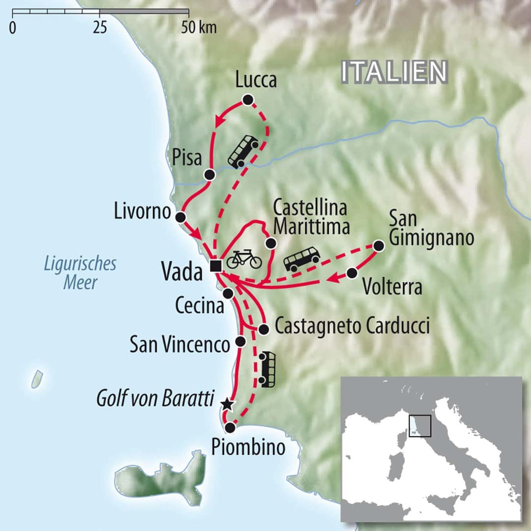 In der Heimat von Paolo Bettini, einem der bedeutendsten Radsportler Italiens haben wir in der Nähe von Cecina in VADA unseren neuen „Heimathafen“ für den Radsport gefunden. Die Hügellandschaft im Hinterland, das Meer und die Toskanische Küste, die „Costa degli Etruschi“ bietet ein ideales Trainingsgebiet für Radfahrer. Die Temperaturen eigenen sich fast das ganze Jahr zum Radfahren. Toskana – das Herz Italiens – von der Natur in verschwenderischer Weise bedacht. Das liebliche Hügelland mit Zypressen, Pinien, Weinbergen und Olivenhainen bestimmen den harmonischen Charakter dieser Landschaft. Besondere Highlights dieser Reise sind der Besuch von Lucca, Pisa, Livorno, San Gimignano und Volterra.
