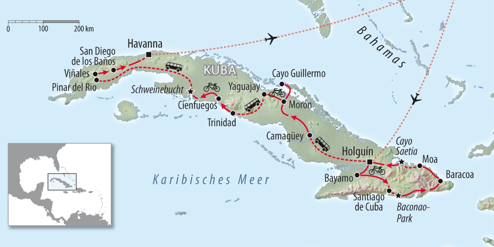 Mit dem Fahrrad durch ganz Cuba! Während dieser Reise durchqueren Sie die gesamte Insel. Sie lernen die bedeutendsten Städte, die schönsten Landschaftsregionen, herrliche Strände sowie paradiesische Inseln kennen. Kultur, Geschichte und Eigenarten dieses „etwas anderen Karibik-Staates“ werden Sie in den unterschiedlichen Landesregionen hautnah erleben können und natürlich überall viele Gelegenheiten haben, immer wieder ganz spontan, mit der freundlichen Bevölkerung in Kontakt zu kommen. Im Reiseverlauf sind kleine Entspannungsaufenthalte an verschiedenen Bilderbuchstränden eingeplant, um zwischen den vielen Eindrücken dieser aufregenden Aktiv-Reise immer wieder entspannen zu können.
