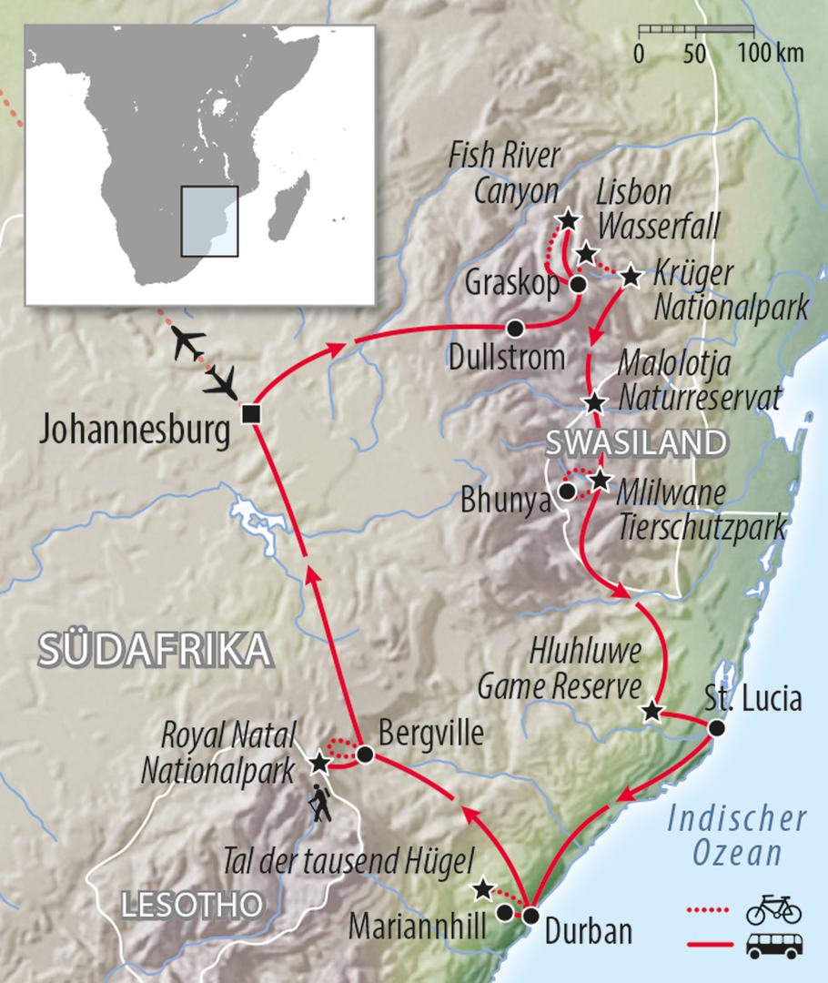 Diese populäre Radreise Südafrika führt Sie zu den landschaftlichen und kulturellen Höhepunkten des östlichen Südafrikas und Eswatinis. Auf den Radetappen zwischen 18 km und 56 km mit wenigen Steigungen und kurzen Wanderungen zeigt Ihnen Ihr Reiseleiter diese extrem abwechslungsreiche Region. Es geht auf der Panoramaroute am Blyde River Canyon entlang und anschließend auf Safari in den berühmten Krüger Nationalpark mit seiner erstaunlichen Artenvielfalt. Sie lernen die interessante Kultur der freundlichen Swasi kennen, bevor es weitergeht in den reizvollen Hluhluwe/Umfolozi Nationalpark mit der größten Nashornpopulation der Welt. Sie besuchen das UNESCO Weltnaturerbe iSimangaliso Greater Wetlands und unternehmen dort eine Bootsfahrt. Per Rad und zu Fuß erkunden Sie die uKhahlambra Drakensberge. Im schönen Tal der tausend Hügel radeln Sie durch das Zululand mit seinen gastfreundlichen Menschen.