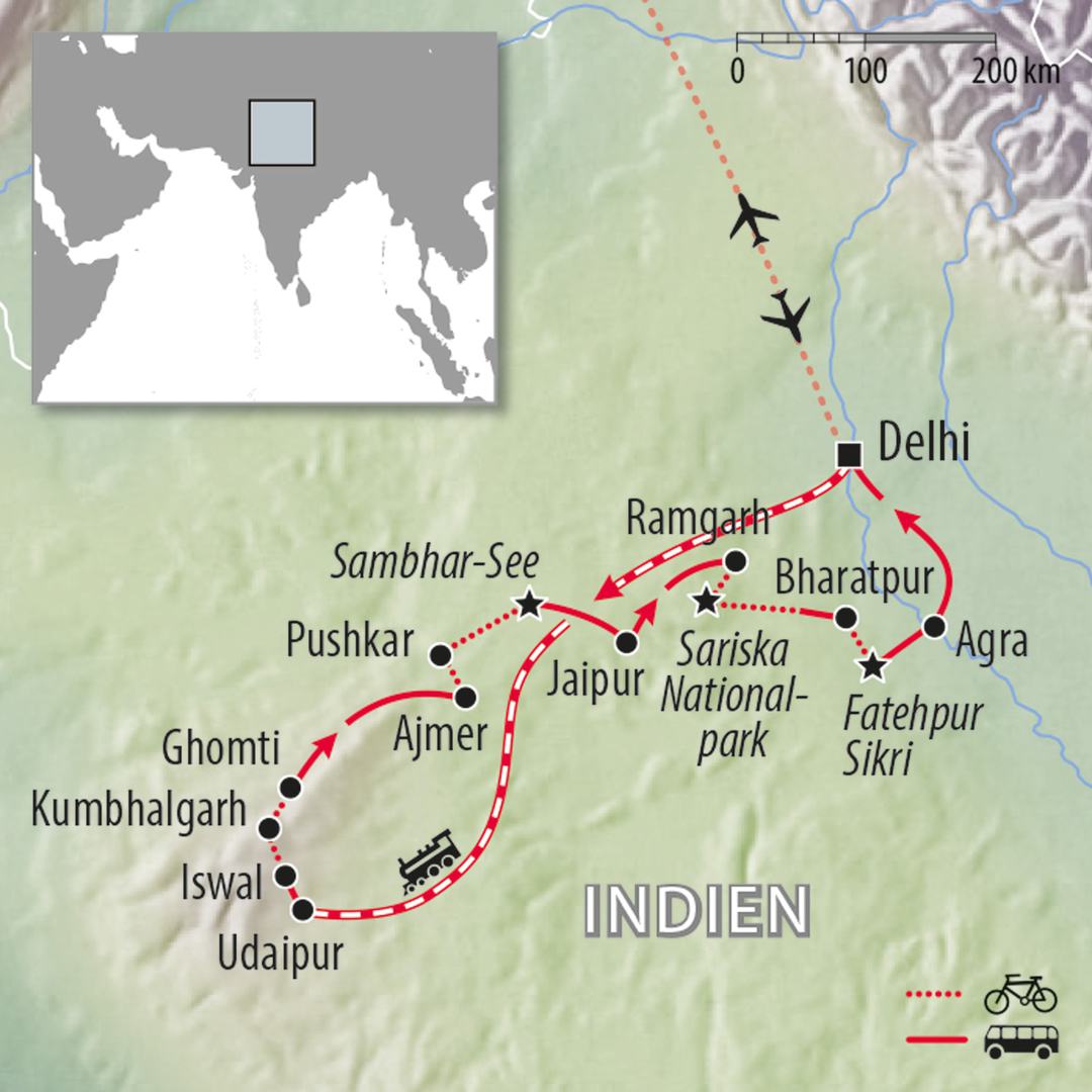 Radurlaub in Indien von Udaipur zum Taj Mahal. Rajasthan hat Landschaften, die von grünen Hügeln bis hin zu unfruchtbaren und sonnenverwöhnten Wüsten variieren. Es finden sich im ganzen Staat Festungen – Forts genannt – deren Zinnen über der Landschaft thronen. Rajasthan ist ein Teil Indiens, der sich durch seiner Farbenpracht und seiner Lebendigkeit Indien so präsentiert, wie es sich der Reisende vorstellt. Die Schönheit fasziniert Reisende bereits seit Jahrunderten. Die Landschaft ist geprägt von Dörfern und Städten so wie von authentischem ländlichem Leben. Jeder Ort – jede Region hat seine eigene Geschichte einer sehr stolzen Hochkultur zu erzählen. Radfahren ist der perfekte Weg, um Rajasthan zu erkunden und bietet einen faszinierenden Einblick in die traditionelle Lebensweise. Sowohl die Städte als auch die Landschaften bei ausgedehnten Radtouren lassen sich so viel besser erfahren wie bei klassischen Rundreisen. Erleben Sie eine Fahrradtour durch faszinierende Landschaften, mit zahlreichen kulturellen Highlights und einem Feuerwerk an Farben, Gerüchen und Genüssen.