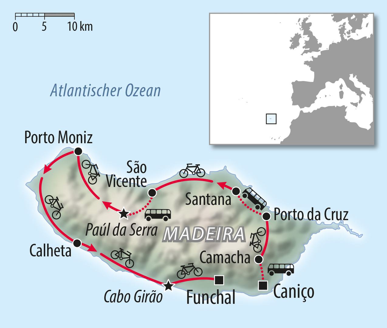 • Bustransfers Caniço – Camacha, Porto da Cruz – Santana und Sao Vicente – Rocha Negra jeweils inkl. Rad