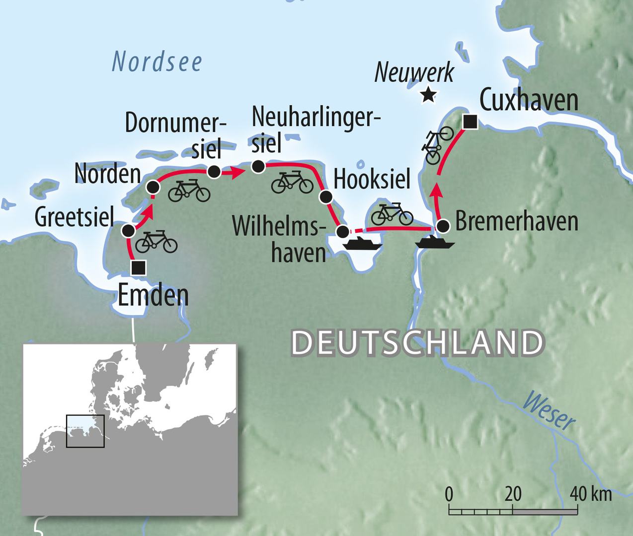 Auf dieser Reise zeigt sich die Nordsee von ihren schönsten Seiten. Sie starten in Emden und fahren zunächst an Ostfrieslands Küsten entlang. Hier erleben Sie während schöner Radtouren eine weite, urige Landschaft am Meer, den Nationalpark Niedersächsisches Wattenmeer sowie ostfriesische Kultur und Sehenswürdigkeiten. Natürlich lockt die Nordsee zu Spaziergängen am Strand und bisweilen zum Baden. Und in Bremerhaven präsentiert sie sich mit faszinierenden Hafenanlagen und Schiffsgiganten. Ihr Ziel ist das Nordseeheilbad Cuxhaven mit reizvollen Stränden, den Fischereihäfen und einem möglichen Ausflug zur Insel Neuwerk. Erleben Sie herrliche Tage am Meer.