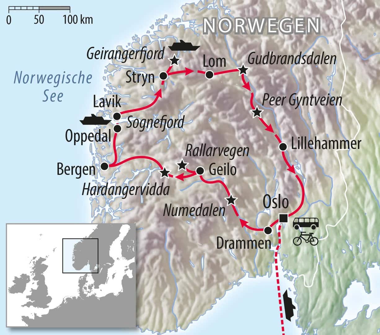 Dennoch: Auch diese Radtour wird Sie fordern. Denn flach ist es vielleicht in Norddeutschland. In Norwegen werden Sie natürlich auch ab und zu den einen oder anderen Berg und Pass bzw. Anstieg zu fahren haben. Aber keine Sorge: Wir wollen diese Tour genießen. Sie fahren ohne Gepäck, denn unser Bus als Begleitfahrzeug hat Ihren Koffer dabei. Und wenn Sie es gemütlich wollen, dann kann Sie auch der Bus mitnehmen. Sie fahren auf Straßen aber auch Schotterwegen. Sie sollten deshalb ein ordentliches Trekking- oder Mountainbike haben. Höhepunkte dieser Reise sind zweifelsohne: Radweg Rallarvegen, Dalsnibba und Geirangerfjord, Alte Strynefjellstraße, Peer-Gynt-Weg, Bergen und Oslo!