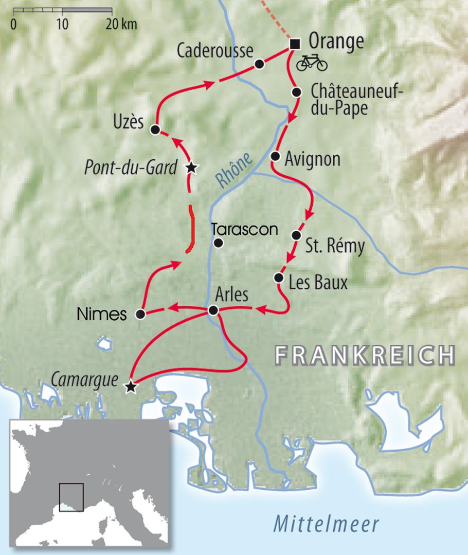 Lernen Sie auf der Radtour Provence – das Sonnenland Frankreichs mit fruchtbaren, üppigen Ebenen, Mittelmeerküste, kulturellen Zentren der Antike und des Mittelalters, duftenden Kräutern und provençalischer Lebensart kennen. Eine herrliche Kulturlandschaft, die mit ihrem einzigartigen Licht und den intensiven Farben schon unzählige Maler wie van Gogh, Gauguin, Picasso, Matisse und Chagall anlockte. Neben der großartigen und abwechslungsreichen Landschaft besticht die Provence natürlich auch durch ihre Geschichte, Kunst und Architektur. Berühmte Bauwerke wie der Papstpalast in Avignon (Weltkulturgut), die Arena in Arles und der Pont du Gard (Weltkulturgut) verzaubern ebenso wie die griechisch-römischen Ausgrabungen von Glanum und die mittelalterliche Stadt Les Baux in den Alpillen. Die Rundtour durch die Camargue, die naturgeschützte Sumpflandschaft im Rhônedelta, ist ein weiterer Höhepunkt. Die berühmten rosafarbenen Flamingos und die weißen Pferde sind die Wahrzeichen dieser Landschaft, welche einen grandiosen Gegensatz zu dem bisher Gesehenen darstellt. Und immer wieder atmen wir das Leben der Provence: buntes Treiben in den Städten, farbenprächtige Märkte, spanische Traditionen, Dorfleben unter Platanen und ein Hauch südlicher Gelassenheit.