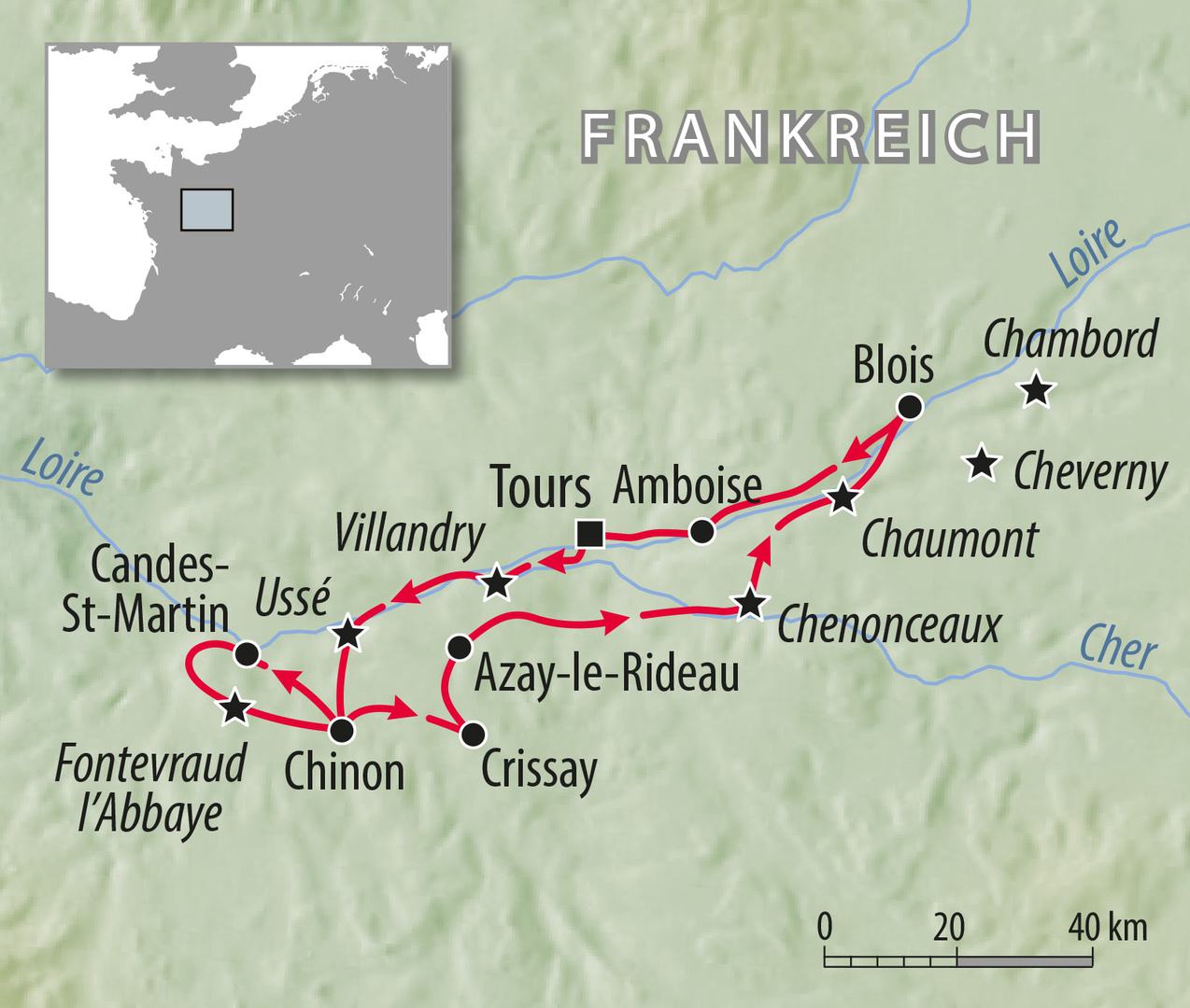 Ein landschaftlicher Höhepunkt steht bevor: Durch die romantische Flusslandschaft, immer dem Indre folgend, gelangen Sie in die hübsche Kleinstadt Montbazon. Ein kurzer Anstieg wartet, ein paar kräftige Tritte in die Pedale und Sie gelangen über einen kleinen Höhenrücken in das Tal des Flusses Cher. Auf Wiesenwegen geht es entlang des Chers nach Bléré, einem kleinen Marktflecken und weiter zu Ihrem geschichtsträchtigen Übernachtungsort Chenonceaux mit Schloss. Schloss Chenonceau ist wohl das schönste aller Loireschlösser und thront in einer einzigartigen Lage. Eine prächtige, zweigeschossige Brückengalerie spannt sich über den Fluss und davor begeistert der herrliche Schlossgarten… aber sehen und entdecken Sie selbst.