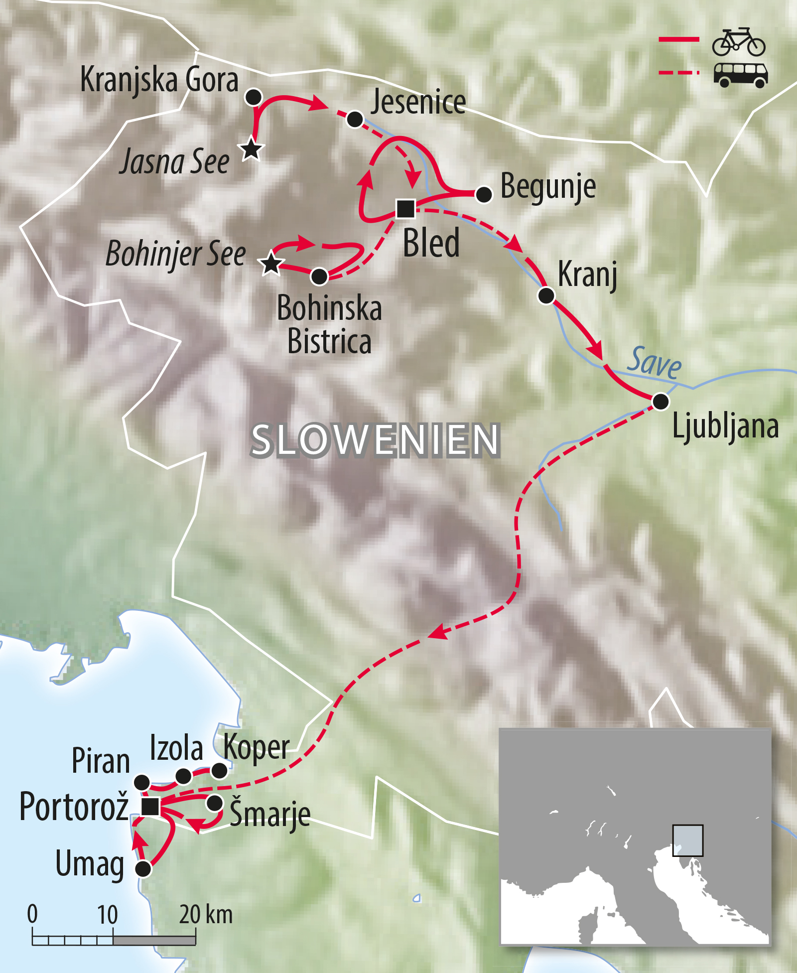 Radreise Slowenien – bedeutet für uns Berge und Meer. Natur, Kultur und wunderschöne Landschaften. Slowenien hat in den letzten Jahren im Radtourismus unglaublich zugelegt, so dass wir es für absolut notwendig halten, den kleinen EU-Staat mit unserem Rad zu erkunden. Die Slowenen sind sehr umweltbewusst, so ist es nicht verwunderlich, dass die Slowenen den Radtourismus fördern und immer neue Radwege ausbauen. Selbst in der Hauptstadt Ljubljana befinden sich bereits zahlreiche Radwege durch das Zentrum. Lernen Sie mit uns einige Highlights bei der Radreise Slowenien kennen. Von den höchsten Bergen bis ans Meer. Vom Naturpark Triglau (Triglav) bis zur herrlichen Slowenischen Riviera. Die Bergwelt um den Nationalpark Triglav (Triglau) ist einzigartig. Mit Kranjska Gora, Bled und der berühmten Insel „Maria im See“ sowie die schöne Küste versprechen eine schöne Slowenien Radtouren und Urlaubsreise. Entdecken Sie auf nachhaltige Weise Radtouren auf den Routen der Slovenia Green. Mit Kranjska Gora, einem berühmten Wintersportort und fantastischer Sommerfrische, dem Bleder See und dem Bohinjer See erkunden Sie im Norden Sloweniens die schönsten Radtouren des Landes. Durch kleine Steindörfer, saftige Wiesen, Weinberge lernen Sie in der 2. Hälfte unserer Slowenien-Tour den gepflegten Radweg Parenzana kennen.