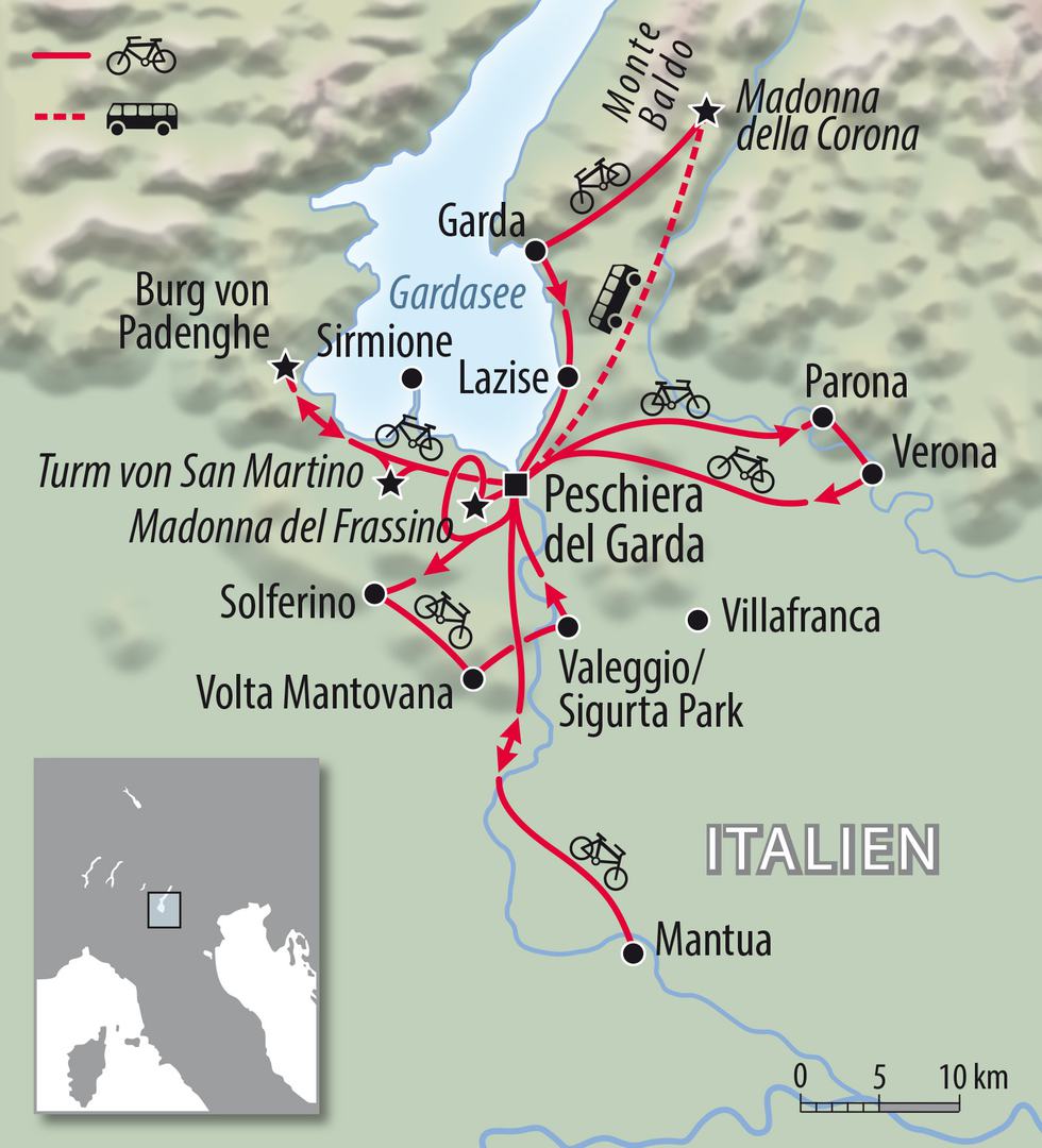 Der Gardasee – bei den Italienern liebevoll Lago di Garda genannt zählt zu den schönsten Seen in Italien. Seine Lage im Norden Italiens ist herausragend und er ist der See von 3 Provinzen. Trentino-Südtirol, Venetien und Lombardei. Die Schönheit des Sees hat schon Wolfgang von Goethe ins Schwärmen gebracht. Das nördliche Ufer wird durch die Gardaseeberge insbesondere dem Monte-Baldo-Massiv beherrscht. Der Süden gehört zur norditalienischen Tiefebene und genau diese Region haben wir für Sie herausgepickt. Die Aussage, in der Gardasee-Region kann man nicht Fahrrad fahren hört man ab und zu. Dem Widersprechen wir völlig, denn der Süden ist absolut genial und bestens für uns Radfahrer geeignet. Und dazu finden wir dort den berühmtesten und vielleicht sogar schönsten Radweg Italiens. Den E – 6 der von Peschierea nach Mantova entlang dem Mincio-Flusses. Botaniker kommen in der Region voll auf Ihre Kosten. Palmen, herrliche Blütenbrachten und Oleander wird Ihr Begleiter sein. Fahren Sie mit uns auf den Spuren der Geschichte Italiens, aber auch der Romantik, die mit Romeo und Julia in Verona unsterblich geworden ist.