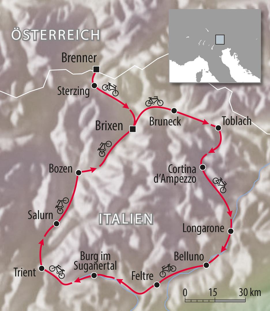Mit dem Fahrrad durch ein Hochgebirge zu fahren, ist für viele Radtouristen ein Traum. Jedoch scheut man sich vor steilen Pässen und langen Anstiegen. Mit dieser Tourenradreise bieten wir unseren Gästen die Möglichkeit, die Alpen mehr oder weniger bequem über Bahntrassenradwege und Flussradwege zu beradeln; richtige hochalpine Pässe müssen nicht überwunden werden. Genießen Sie die traumhafte Alpenlandschaft von Südtirol und Venetien, lernen Sie wunderbare Städte wie Bruneck, Cortina d’Ampezzo, Belluno, Burg im Suganertal, Trient, Brixen oder Bozen kennen. Genießen Sie den Blick auf die drei Zinnen in den Dolomiten. Eine Woche alpines Raderlebnis der extra Klasse.