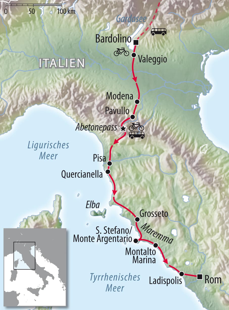 Ein paar Kundenstimmen: „Die Einfahrt nach Rom war für mich beeindruckend und eines meiner schönsten Raderlebnisse überhaupt“. „Alleine hätte ich das nicht geschafft, aber in der Gruppe war es einfach fantastisch!“. „Italien auf dem Rad! Diese Tour hat einfach Alles!”, so der Tenor unserer Kunden. Bei dieser Radreise jagt ein Höhepunkt den anderen. Der Gardasee, die Poebene, der Abetonepass, Pisa mit der Piazza dei Miracoli, die Maremma, die Halbinsel Monte Argentario mit Porto Santo Stefano, die alte Via Aurelia und natürlich Rom! Stille Wege, hektisches Gewirr in den Städten, sanfte Flussläufe, Meer und Berge! Und dazu eine radbegeisterte Nation! Diese Reise wird garantiert auch für Sie ein einzigartiges Erlebnis werden!