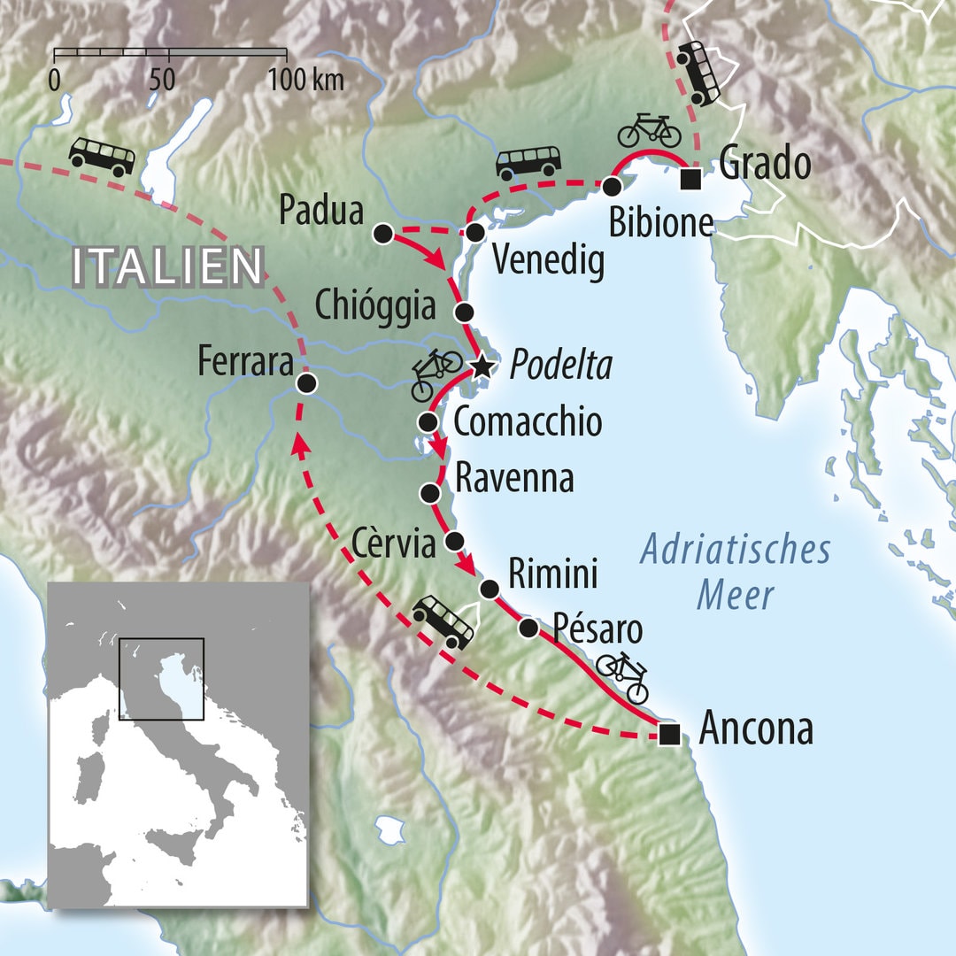 Besichtigen Sie mit uns Venedig bei einer Stadtführung. Bei der Radreise von Grado nach Ancona besuchen Sie berühmte Städte wie Ferrara, Padua, Chioggia, wir radeln durch das wunderschöne Po-Delta, besichtigen das byzantinische Ravenna, bewundern die weißen Strände von Cesenatico und Rimini und besuchen Pesaro und Ancona. Mit dem Fahrrad durchfahren Sie wunderschöne Naturschutzgebiete (Parco Naturale Monte San Bartolo, Parco Regionale Naturale del Conero) und erleben die magische Stimmung der Lagune von Venedig hautnah vom Fahrradsattel. Und immer wieder lockt das Mittelmeer zu einer Erfrischung.