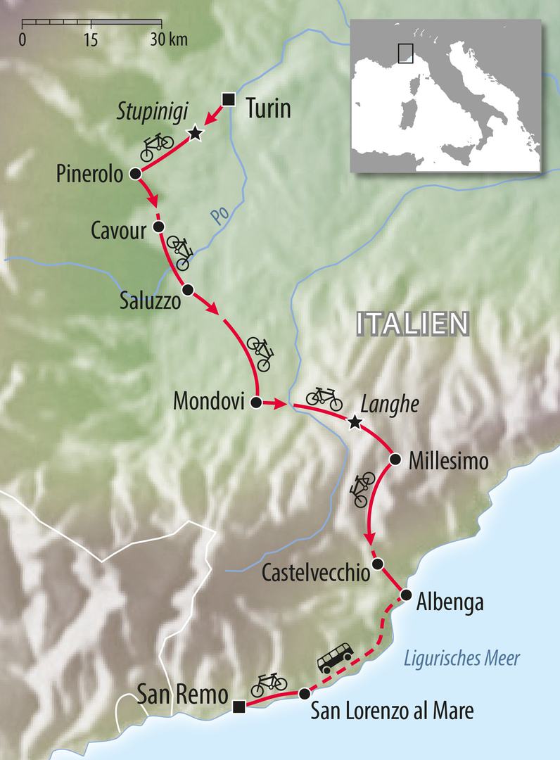 Auf den Spuren des bekannten Radklassikers von Mailand nach San Remo geht’s von den Alpen bis ans Meer. Etwas hinkt jedoch der Vergleich… So beginnen Sie die Reise im royalen Turin und Sie sollen das Ziel nicht an einem Tag erreichen. Und glauben Sie uns, bei dieser herrlichen Strecke, den charmanten und kulturträchtigen Etappenorten, den fantastischen Ausblicken und den betörenden Düften würden auch die Radprofis lieber gemächlich durch die Landschaft rollen und so wie Sie viel Zeit für die Genüsse am Wegesrand haben. Kultur, Landschaft und Kulinarik werden bei dieser Radtour auf einzigartige Weise verbunden und sorgen so täglich für Kurzweil und Begeisterung. Sie müssen also kein Radprofi sein um San Remo per Fahrrad erreichen zu können! Fausto Coppi, Eddy Merckx, Erik Zabel oder Marc Cavendish … sie alle würden lieber diese gemütliche Variante wählen. Wenn sie nur könnten, so wie Sie…