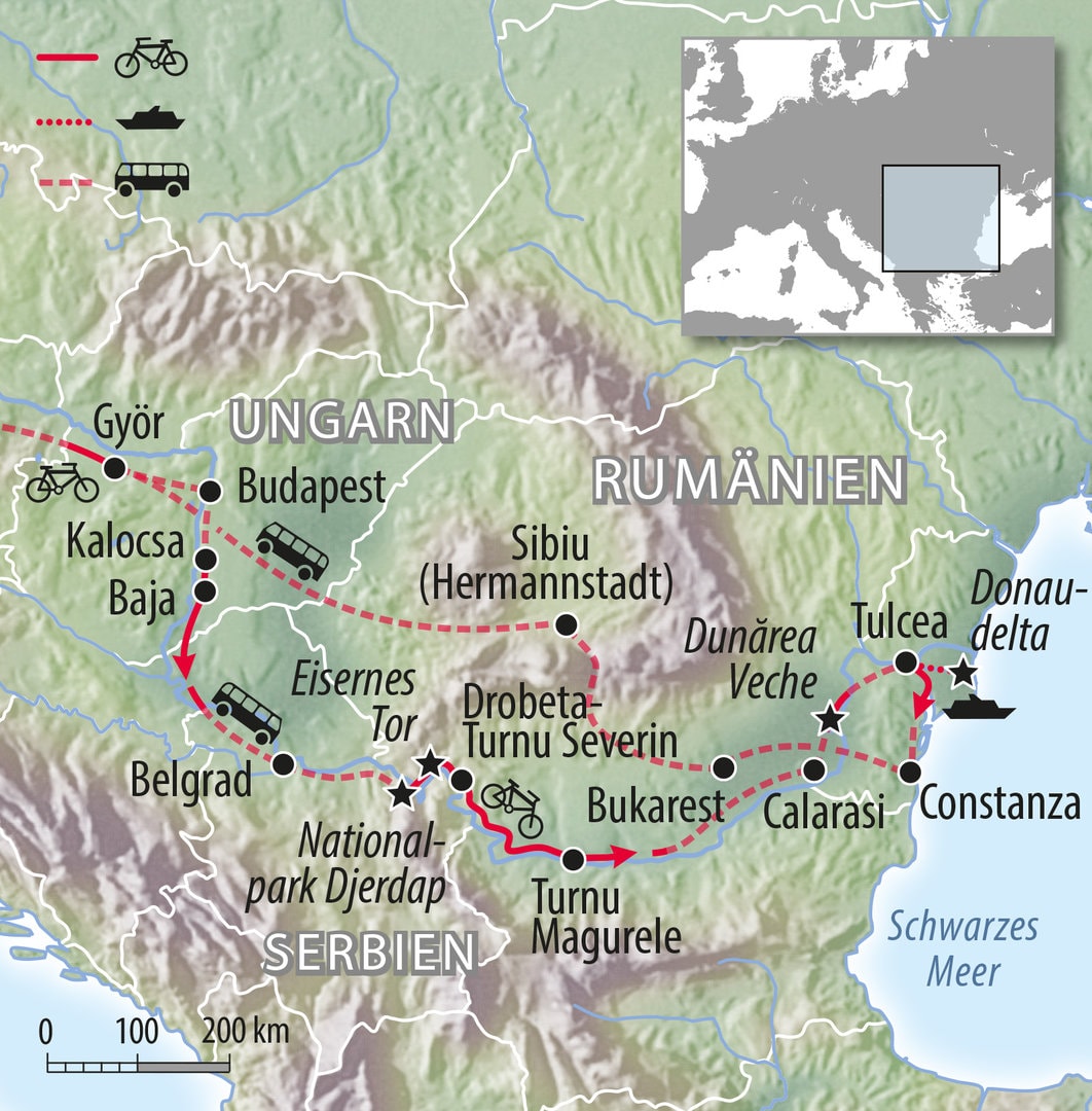Mit dieser Aktivreise haben wir eine Radreise in unserem Programm, die sich deutlich von unseren anderen Radreisen unterscheidet. Fahren Sie mit uns in die Vergangenheit. Erleben Sie das ursprüngliche Rumänien mit Pferdekutschen und Gänsen in den Dörfern auf der Straße. Und lernen Sie das moderne Rumänien kennen, das pulsierende Bukarest oder die faszinierende Stadt Constanza am Schwarzen Meer. Eine Reise entlang der Donau, die ja durch zehn Staaten fließt.Lernen Sie in Ungarn, Serbien und Rumänien auf unserer Reise kennen.