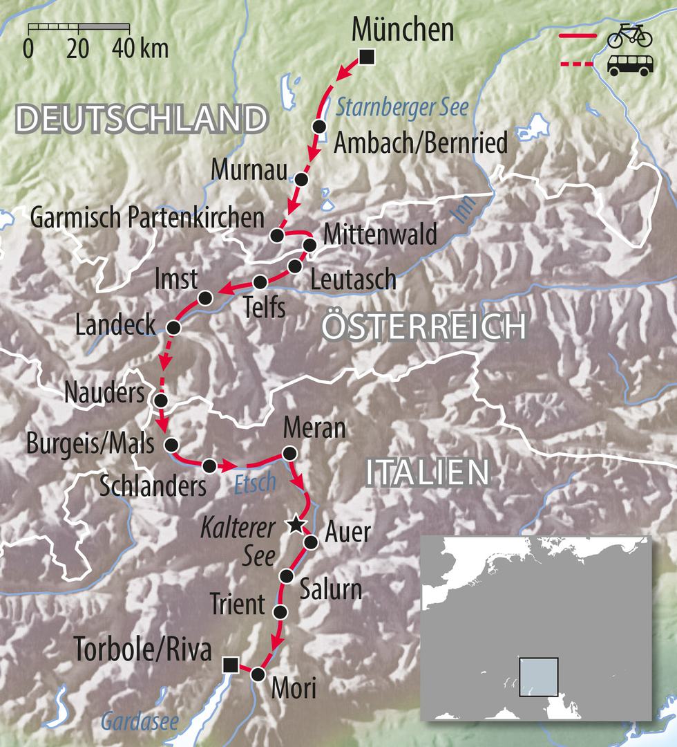- Sammeltransfer (mit zentraler Ein- und Ausstiegstelle) von Torbole nach München, DI, MI, FR, SA, SO, Kosten pro Person € 130,- inkl. Rad; Reservierung erforderlich, zahlbar vorab