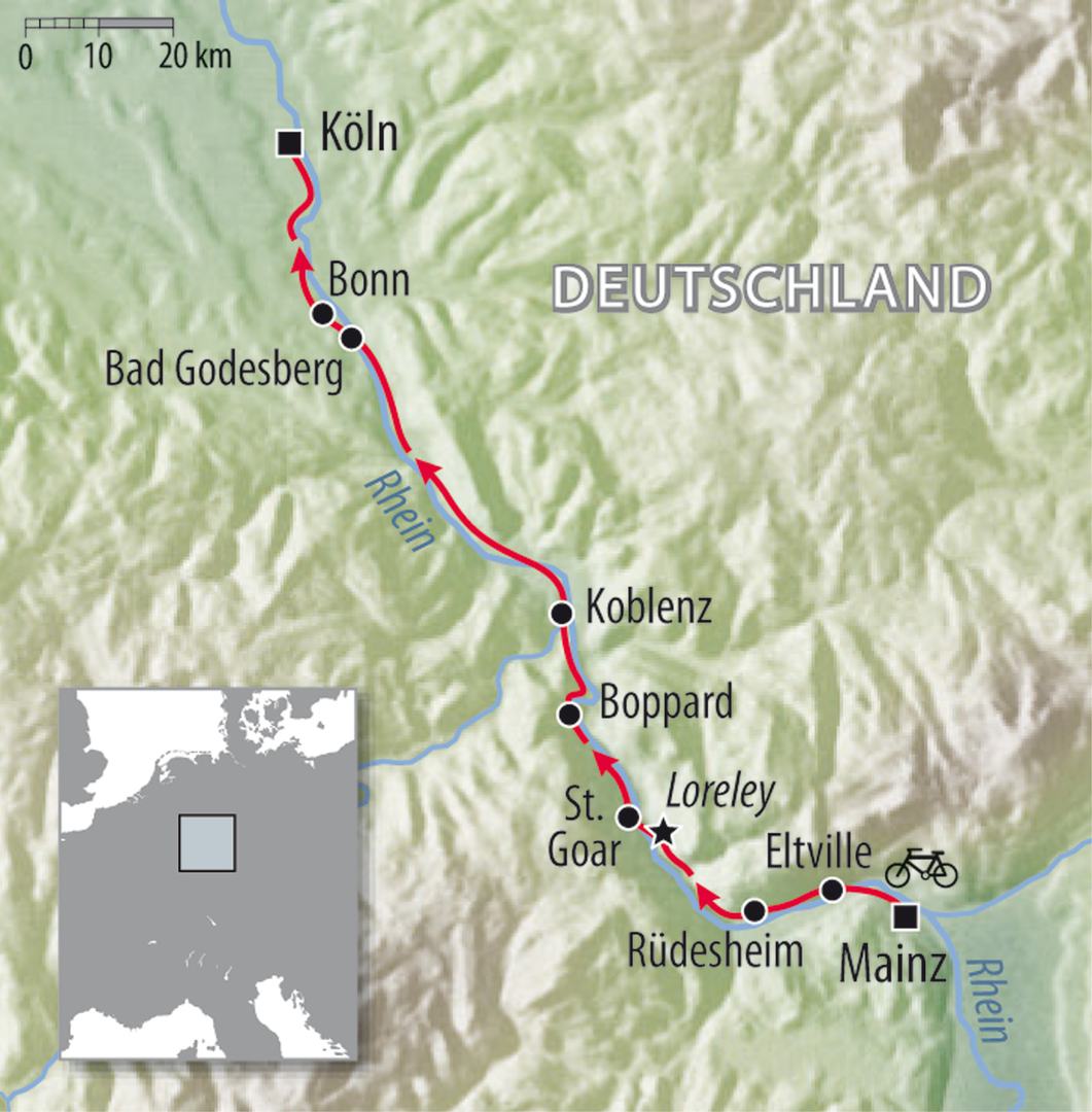 Radfahren Rheinradweg. Thermalquellen und Heilwasser lockten schon vor 2000 Jahren die Römer an den Rhein. Heute kommen die vielen mittelalterlichen Burgen, der Weinanbau und die sehenswerten Städte hinzu und ziehen nicht nur Radfahrer an. Aus aller Welt bereisen die Besucher das Rheintal (seit 2002 Weltkulturerbe der UNESCO) zwischen Mainz und Köln und bewundern diese Kulturlandschaft. Warum also in die Ferne schweifen…?