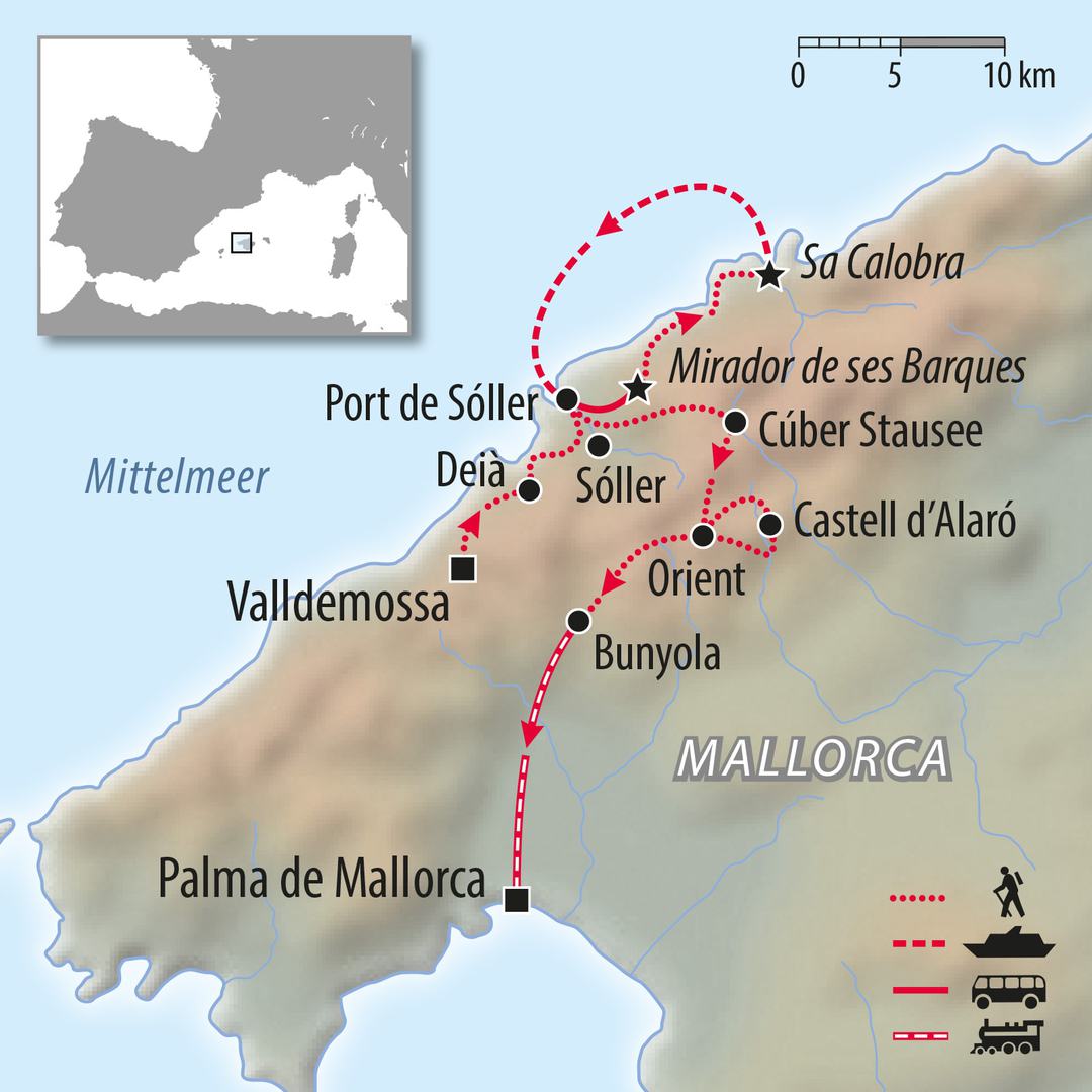 Auf den Tageswanderungen entdecken Sie die Wanderklassiker Mallorcas, für die Sie eine gute Grundkondition mitbringen sollten. Gewandert wird auf guten, teils steinigen Wanderwegen. Für die Wanderung von Valldemossa nach Deia ist Trittsicherheit und Schwindelfreiheit erforderlich.